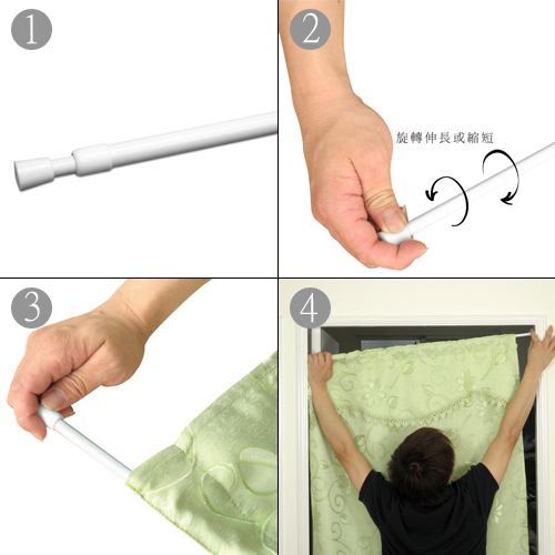 1.門簾桿本體。 2.將門簾桿細端可用選轉方式,轉至適當長度。 3.將門簾桿插入門簾穿管處。 4.將門簾桿長度轉至約莫比門框長約1cm~2cm,以斜插方式將門簾桿固定於門框,將門簾桿位置調整至門框適當 處,在調整至水平即可。 |