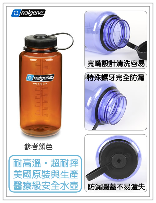 美國nalgene原廠-1000cc彩色寬嘴水壺 (ng21782013-004-1000) nalgene產品,來自美國最大的實驗室及醫療容器生產商。 也代表了防漏,耐高溫,耐用與最可靠的品質保證! 所有產品均在美國當地生產,經過iso 9001與醫療器材品質認證。 也擁有美國fda食品及藥品管理局的gmp 認證。 讓nalgene的絕佳品質,幫您守護每一滴純淨的水! 商品特色 1.美國原裝進口,最優質的水壺商品。 2.易清洗,耐摔,不易受酸蝕,不易殘留味道。 3.窄嘴設計,減少飲用時外漏的尷尬。 4.選用polycarbonate(pc)材質,經久耐用保證不漏水。 5.耐高溫達135度c,低溫可承受達-135度c。 6.可裝冷熱飲,熱湯,奶類,糖果或粉狀調製食品。 7.杯身附尺規,可當成量杯使用。 8.商品使用通過嚴格的美國iso 9001與13485認證。 9.材質安全無害,通過美國食品及藥品管理局gmp認證。 |