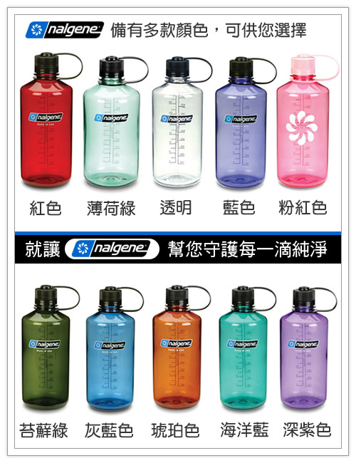 美國nalgene原廠 - 1000cc彩色窄嘴水壺 (ng20782014-003-1000) nalgene產品,來自美國最大的實驗室及醫療容器生產商。 也代表了防漏,耐高溫,耐用與最可靠的品質保證! 所有產品均在美國當地生產,經過iso 9001與醫療器材品質認證。 也擁有美國fda食品及藥品管理局的gmp 認證。 讓nalgene的絕佳品質,幫您守護每一滴純淨的水! 商品特色 1.美國原裝進口,最優質的水壺商品。 2.易清洗,耐摔,不易受酸蝕,不易殘留味道。 3.窄嘴設計,減少飲用時外漏的尷尬。 4.選用polycarbonate(pc)材質,經久耐用保證不漏水。 5.耐高溫達135度c,低溫可承受達-135度c。 6.可裝冷熱飲,熱湯,奶類,糖果或粉狀調製食品。 7.杯身附尺規,可當成量杯使用。 8.商品使用通過嚴格的美國iso 9001與13485認證。 9. 材質安全無害,通過美國食品及藥品管理局gmp認證。 10.罐口為3.8公分。 |