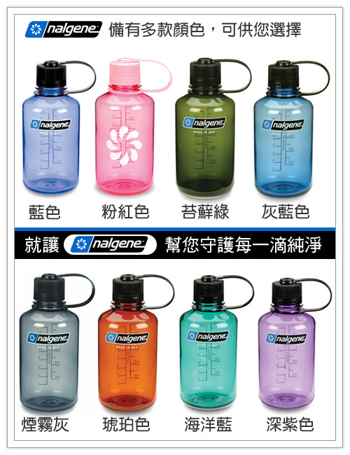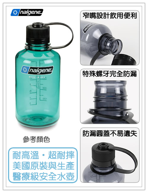 美國nalgene原廠 - 500cc彩色窄嘴水壺 (ng20782005-011-500) nalgene產品,來自美國最大的實驗室及醫療容器生產商。 也代表了防漏,耐高溫,耐用與最可靠的品質保證! 所有產品均在美國當地生產,經過iso 9001與醫療器材品質認證。 也擁有美國fda食品及藥品管理局的gmp 認證。 讓nalgene的絕佳品質,幫您守護每一滴純淨的水! 商品特色 1.美國原裝進口,最優質的水壺商品。 2.易清洗,耐摔,不易受酸蝕,不易殘留味道。 3.窄嘴設計,減少飲用時外漏的尷尬。 4.選用polycarbonate(pc)材質,經久耐用保證不漏水。 5.耐高溫達135度c,低溫可承受達-135度c。 6.可裝冷熱飲,熱湯,奶類,糖果或粉狀調製食品。 7.杯身附尺規,可當成量杯使用。 8.商品使用通過嚴格的美國iso 9001與13485認證。 9. 材質安全無害,通過美國食品及藥品管理局gmp認證。 10.罐口為3.8公分。 |