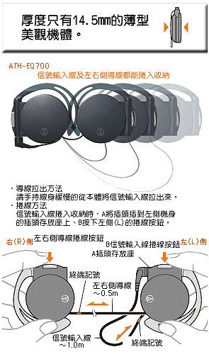 鐵三角 ath-eq700搭載可提升聲音解晰度的釹鐵硼磁鐵30mm驅動單元,輸出音質重低音效果分明,可輸出具迫力感的數位音效,再現乾淨清晰的高音質。耳機 採雙邊自動收線設計,輕輕鬆鬆即可將耳機線收納整齊。耳機本體採14.5mm薄型設計,佩戴輕巧無負擔。耳機使用時 可依所需調整引線的長度,不但使用方便外,也可解決耳機線容易纏繞而產生的困擾。體積輕巧、攜帶方便,適合於 mp3、隨身聽、隨身cd、收音機、迷你音響…等使用。 |