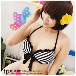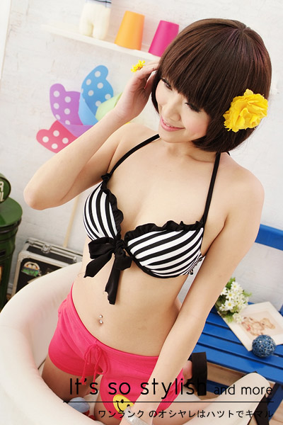 大方的斜條紋搭配上荷葉滾邊帶出濃濃的小女人味道, 胸前的柔美綁結讓設計更加迷人,有鋼圈的貼心設計還能將胸型襯托的豐滿漂亮喔! |